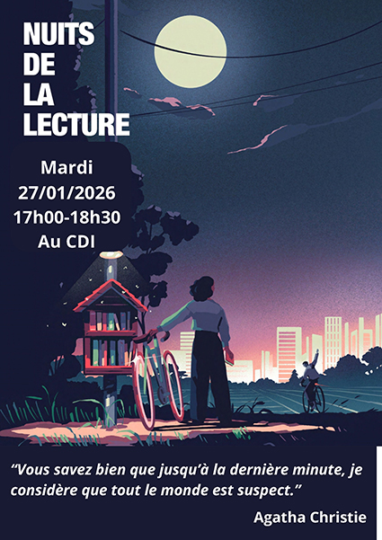 Mardi 27 janvier 2026, à l’occasion de la dixième édition des Nuits de la lecture, Madame CARTRON, professeur documentaliste au collège, a proposé une « soirée de la lecture » qui s’est déroulée de 17h00 à 18h30 au CDI. Cette soirée était organisée sous forme d’ateliers autour des romans policiers d’Agatha Christie, à l’occasion de la célébration des 50 de sa mort.